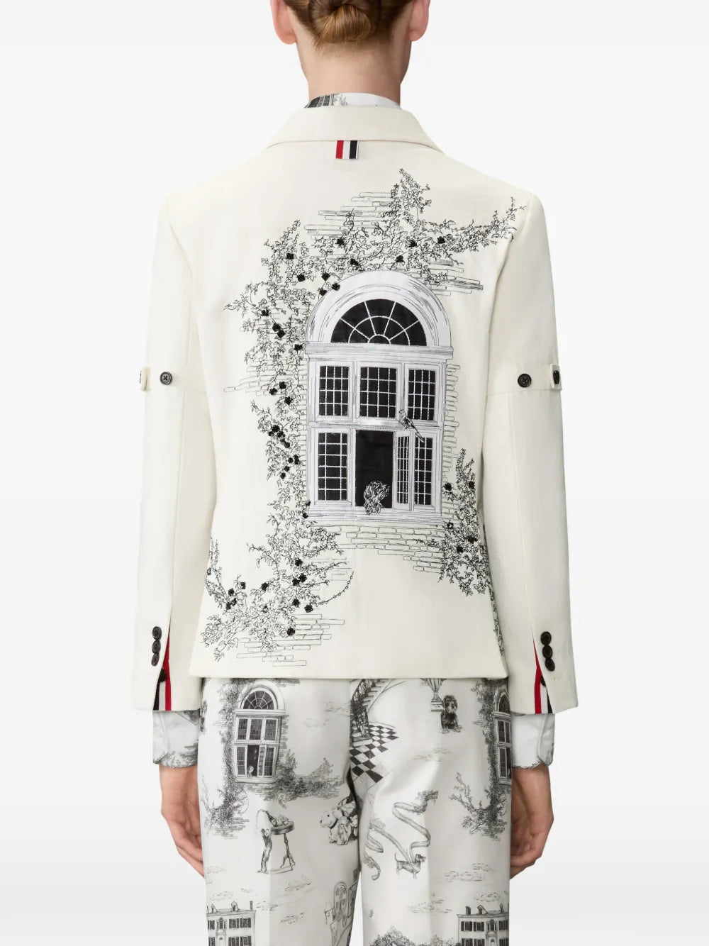 The Thom Browne Relaxed Fit Classic Sportcoat delivers sophisticated American tailoring with a modern relaxed silhouette. Crafted from premium wool in classic cream, featuring the brand's signature whimsical embroidered artwork and colorful striped lining. The deconstructed construction and playful design elements create a perfect balance of formal elegance and contemporary style.