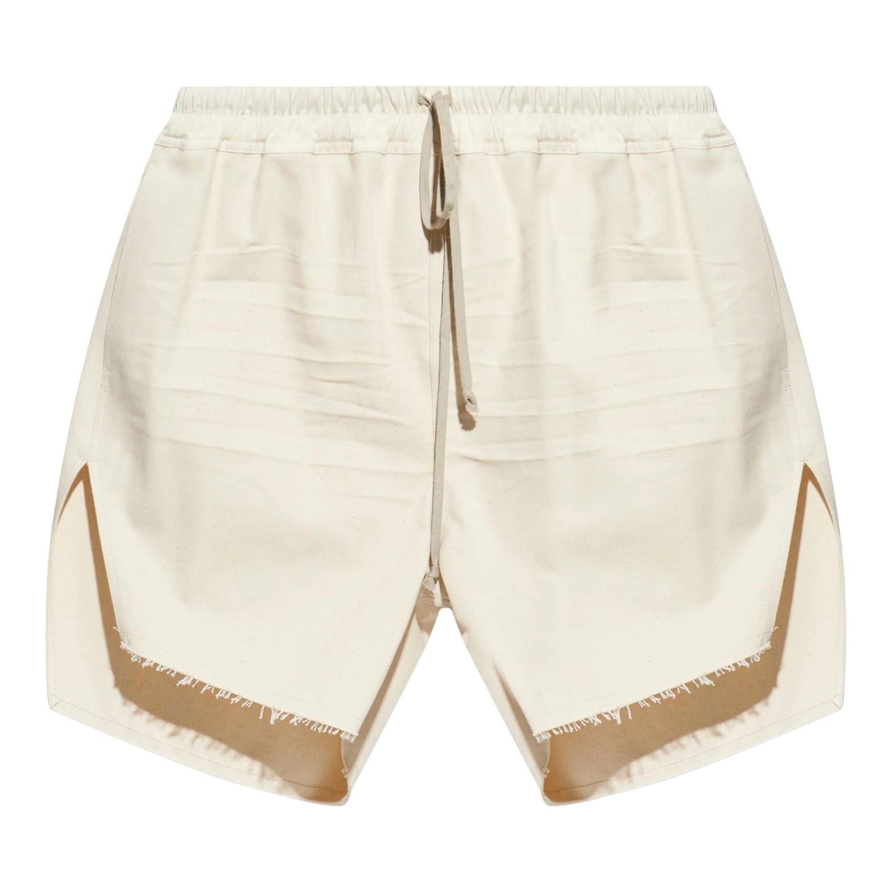These boxers are above knee length with a loose fit. They have an elasticized waistband with drawstring, side pockets and beveled splits in the hem at the side seams.