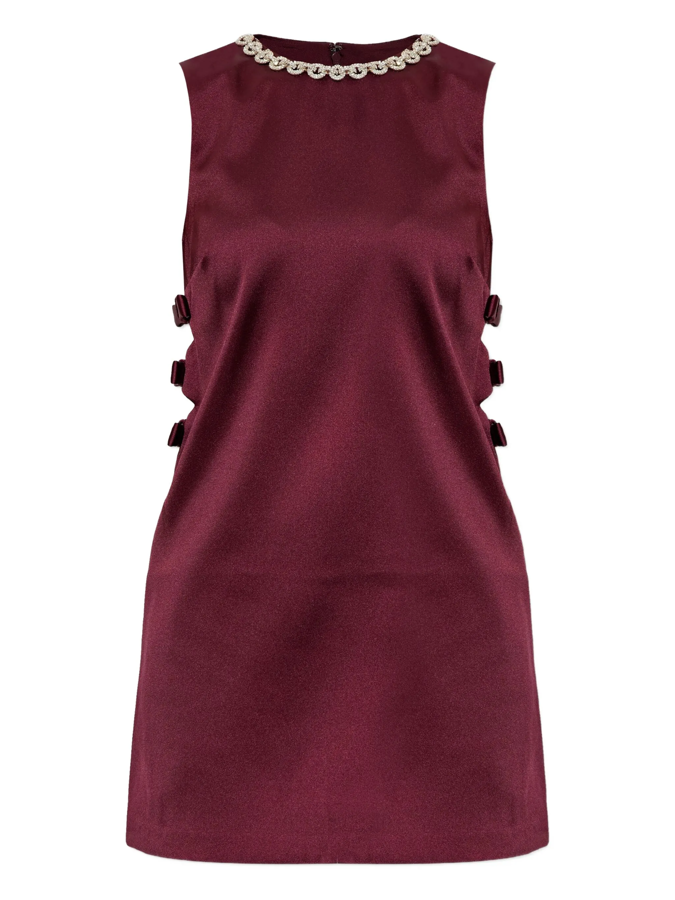 Revel in the rich texture of burgundy satin in this Mod-inspired mini dress. Bow motifs add extra charm and spotlight the daring side cut-outs. Style its shift silhouette with flats and heels alike.