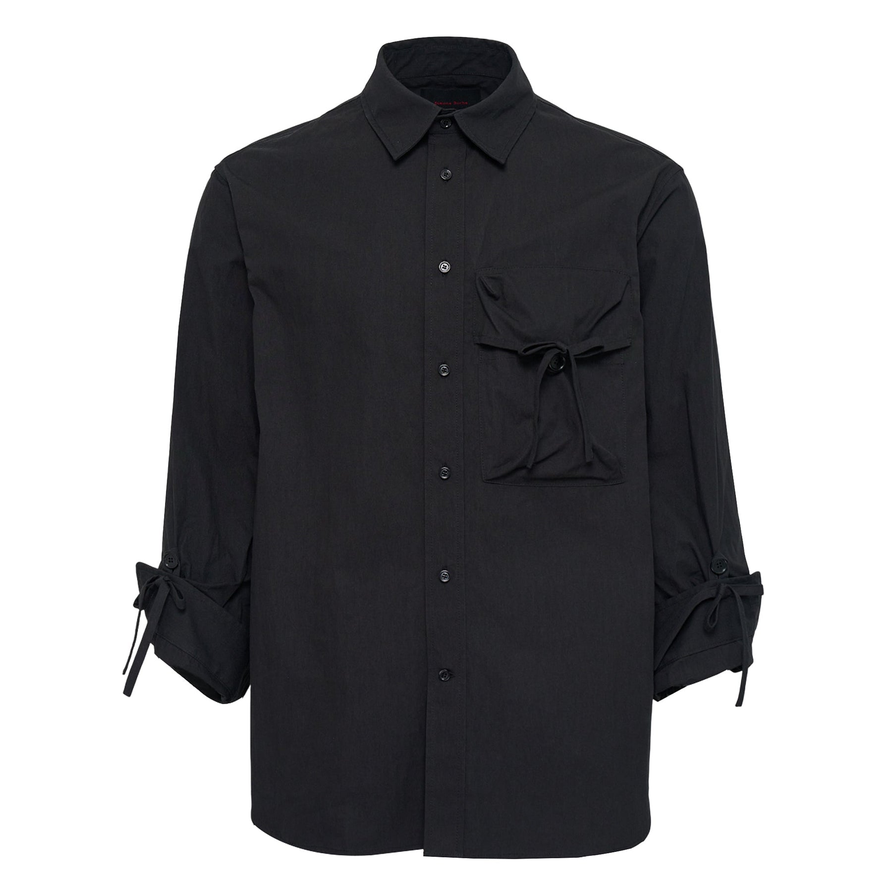 A workwear inspired overshirt crafted from a waxed cotton. It features decorative bows at the front pocket and sleeves that function as button closures.