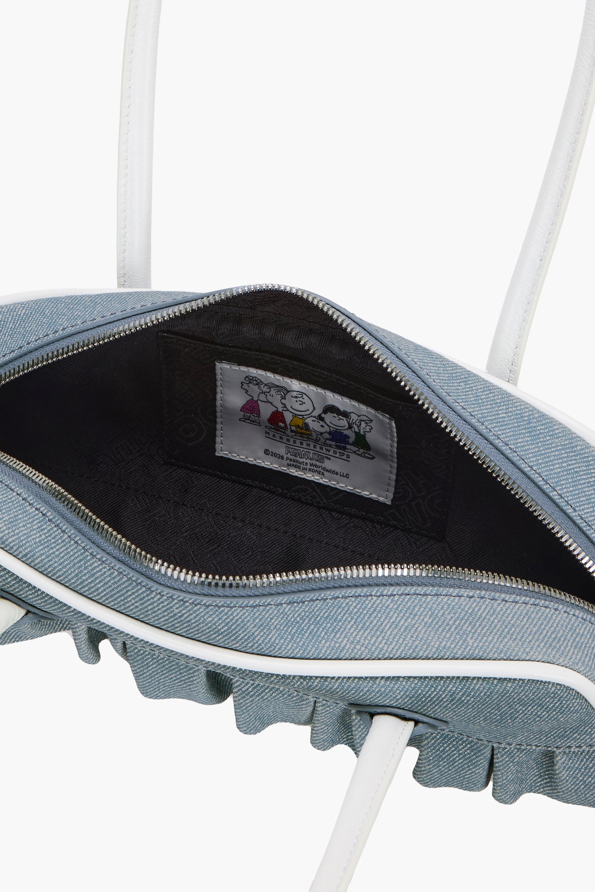 MARGESHERWOOD Soft Boston Mini Piping delivers contemporary elegance with structured design and premium craftsmanship. Crafted from light blue denim with contrast white leather handles and trim, featuring pleated detailing around the base for added texture. The compact Boston silhouette with top zip closure creates a versatile statement piece perfect for modern styling.