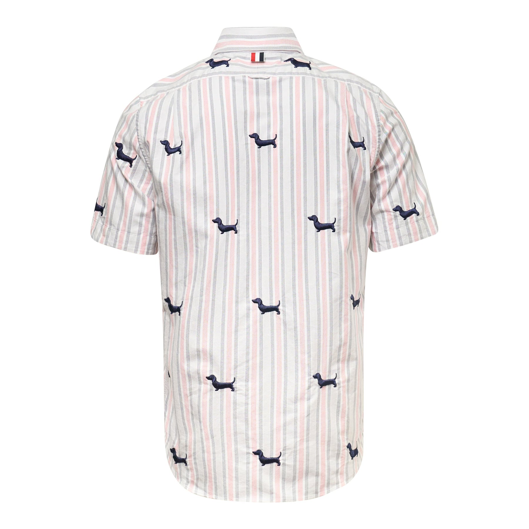 The Thom Browne Straight Fit Button Down Shirt delivers classic American menswear with contemporary tailoring and signature whimsical details. Crafted from premium cotton oxford in soft striped pattern featuring playful embroidered dachshund motifs throughout. The straight fit silhouette and point collar create a refined yet playful aesthetic that defines modern preppy sophistication.