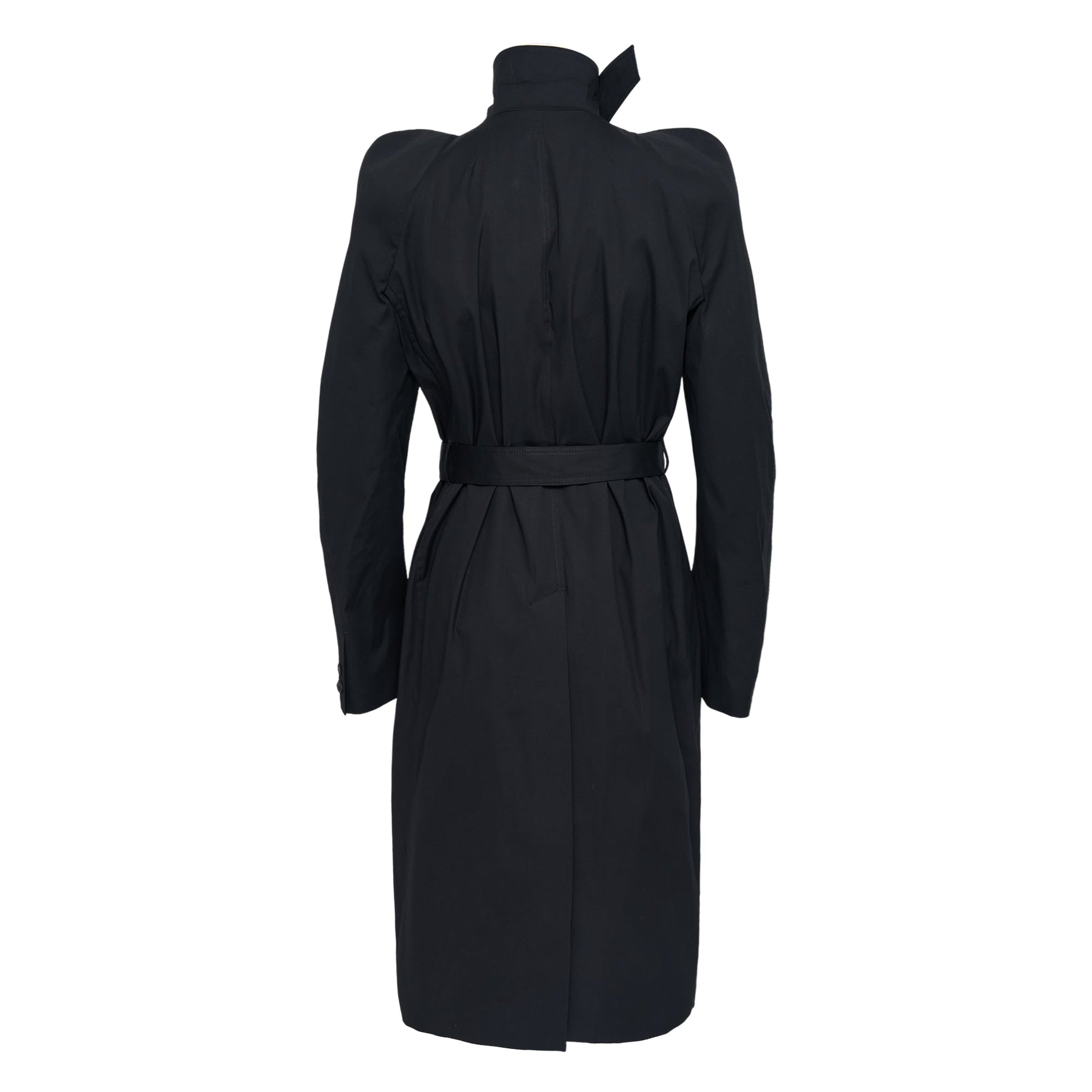 Rick Owens Temple Trench Heavy Poplin delivers avant-garde outerwear with architectural silhouette and dramatic construction. Crafted from heavy-weight cotton poplin in deep black, featuring structured shoulders and a belted waist for striking proportions. The signature high collar and asymmetrical button closure create Rick Owens' distinctive dark aesthetic.
