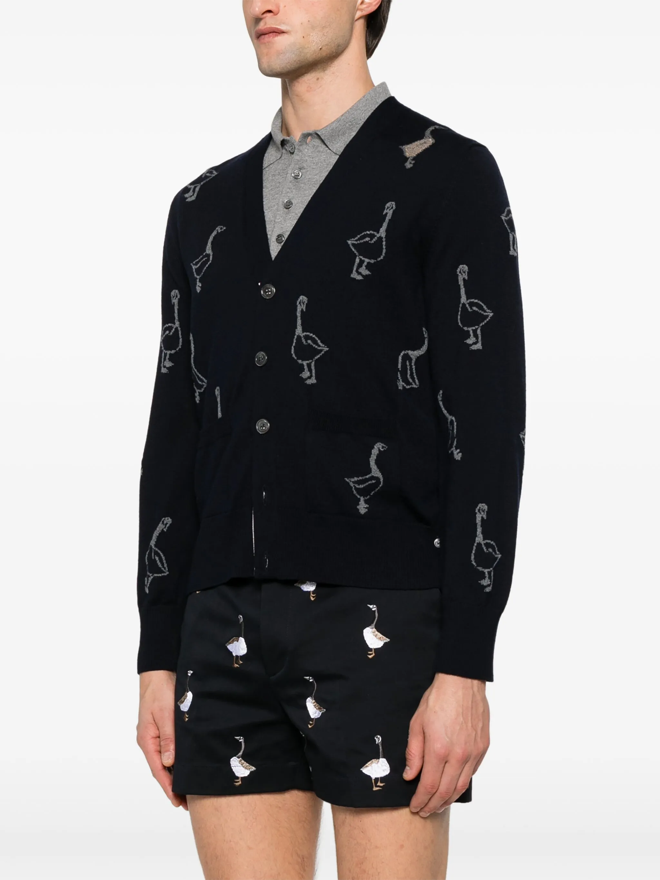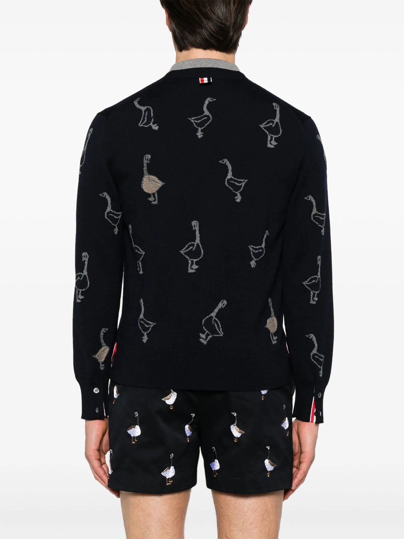 Club21 - Thom Browne - Geese Intarsia Merino Wool Relaxed Fit V Neck Cardigan Men - CARDIGANS - Navy