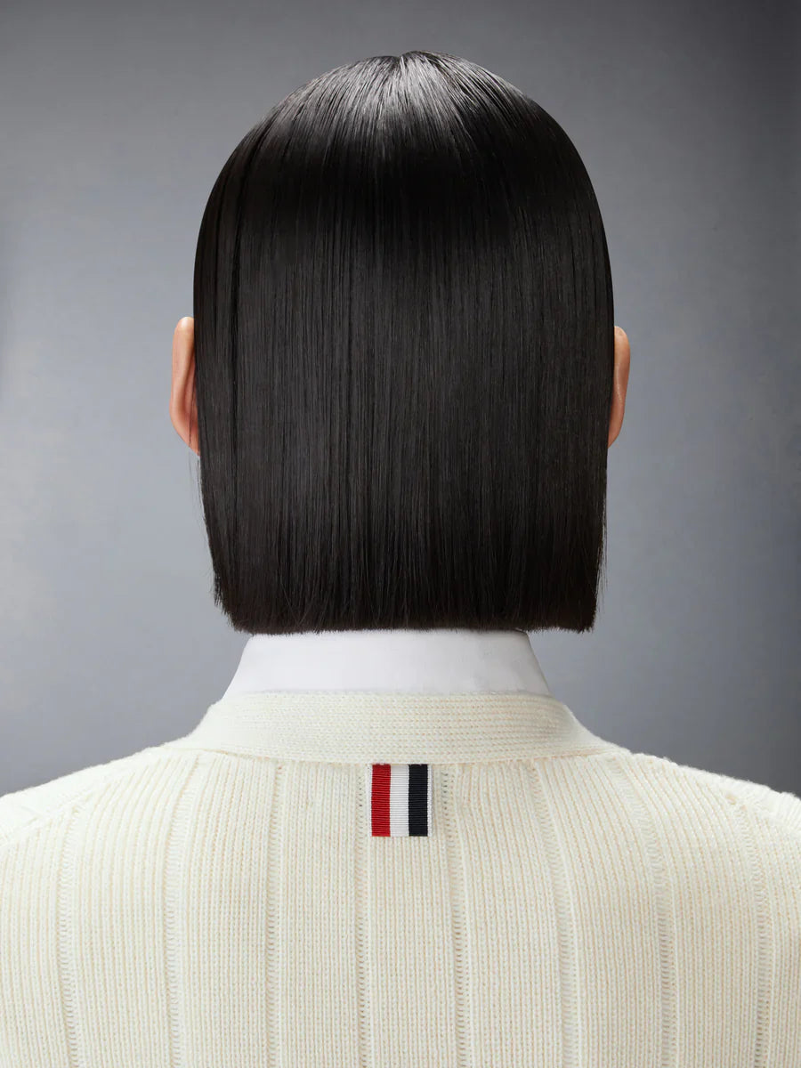 Thom Browne Merino Wool V Neck Cardigan delivers preppy sophistication with signature American luxury tailoring. Crafted from premium merino wool in classic cream, featuring the brand's iconic tricolor stripe detailing at hem and cuffs. The cropped silhouette and cable-knit construction embody Thom Browne's refined schoolboy aesthetic.