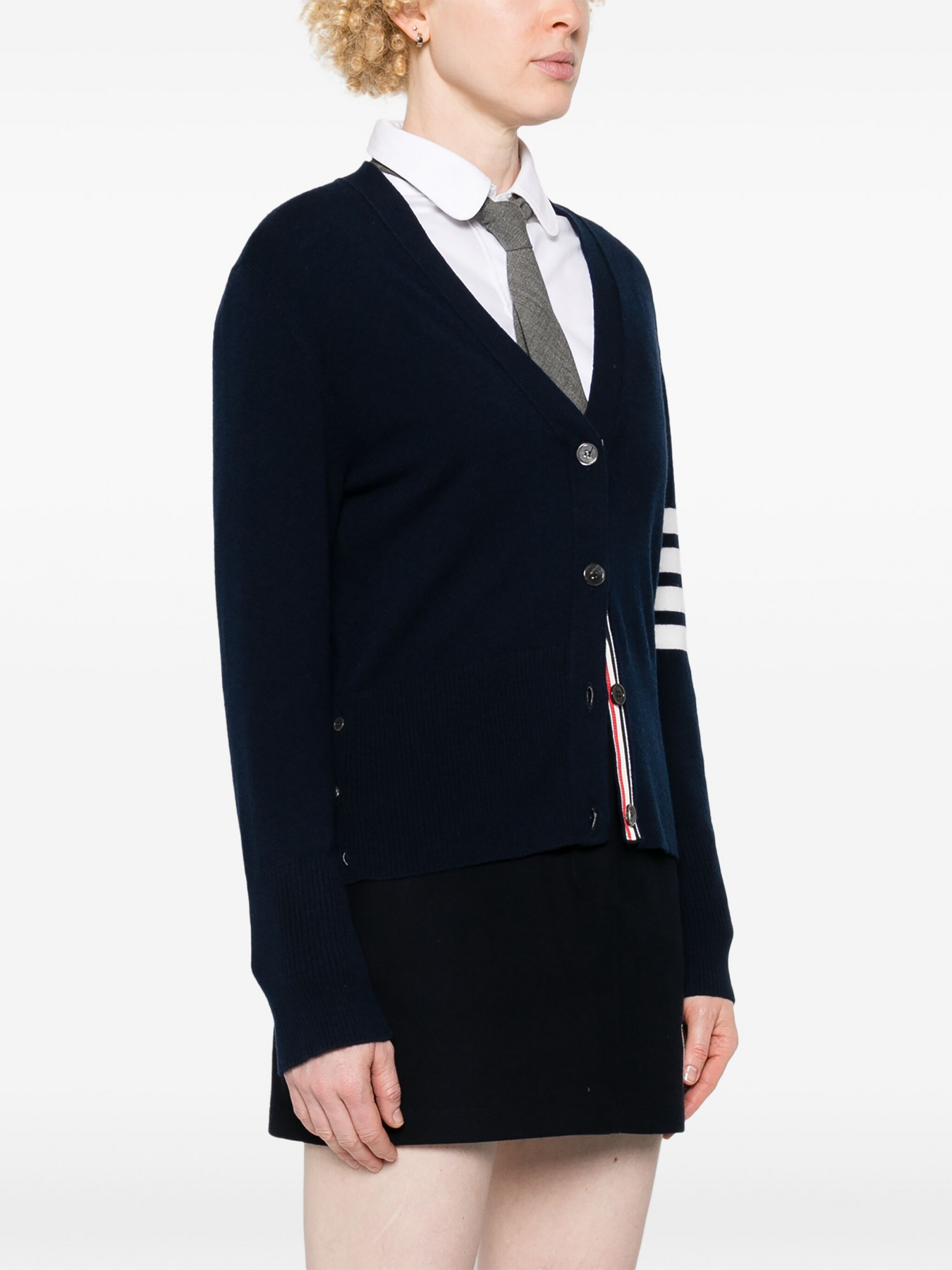 Our Mr. & Mrs. Gingerbread Merino Wool 4-Bar V-Neck Cardigan in rich navy. This silhouette exudes Thom Browne's mastery of minimalistic design and tailored excellence. A front button closure is at center, while two festive gingerbread rest at back.