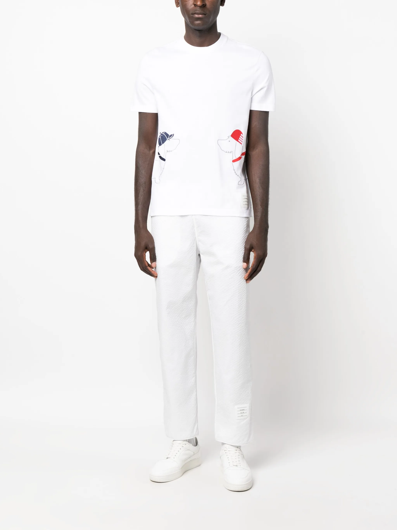The Thom Browne Short Sleeve Tee is a distinctive piece from the brand's collection, notably featuring a playful graphic design of two dogs wearing baseball caps. This design is embroidered on the front of the white cotton tee.
