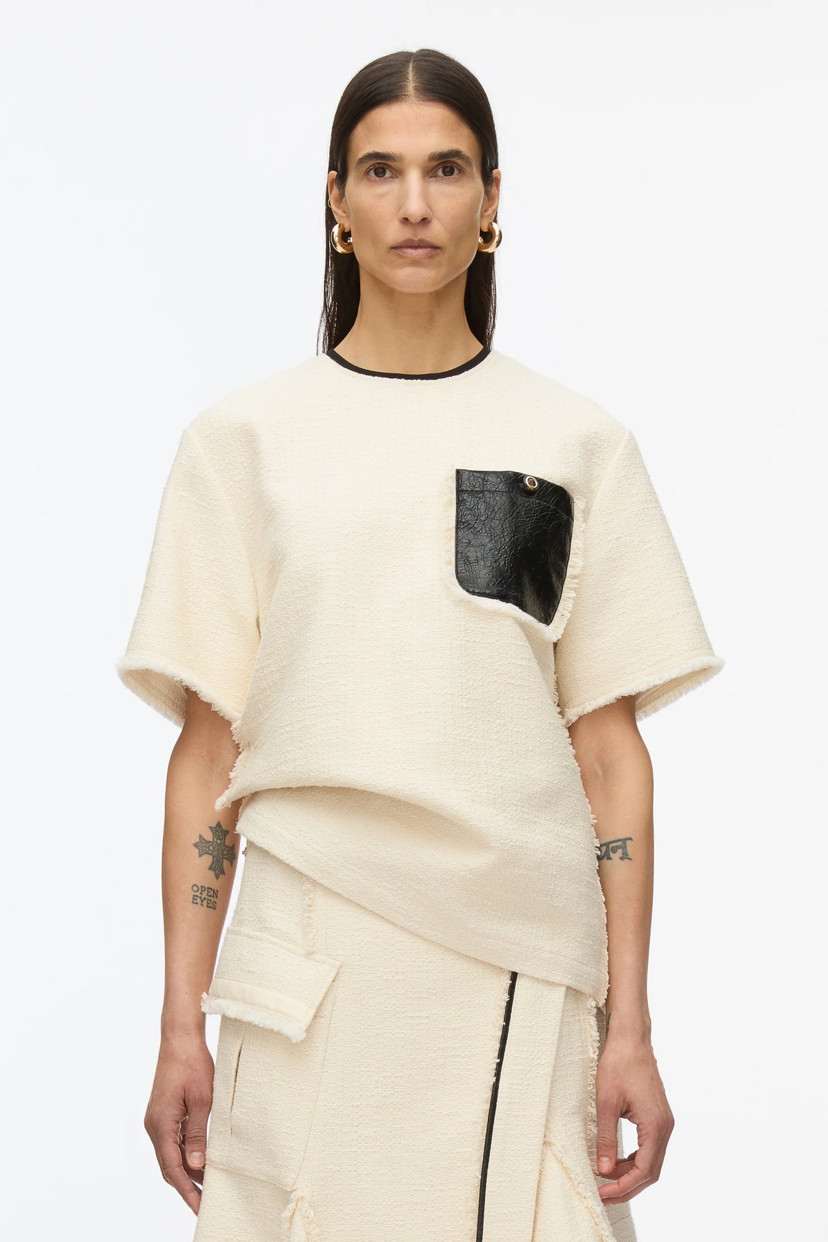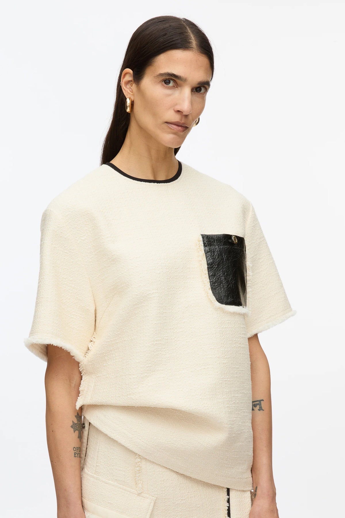 The 3.1 Phillip Lim Tweed Boxy Tee delivers contemporary luxury with architectural silhouette and premium material contrast. Crafted from textured tweed fabric in cream with contrasting black faux leather pocket detail and matching trim at neckline. The oversized boxy fit and raw edge detailing create a modern statement piece that bridges casual and sophisticated styling.