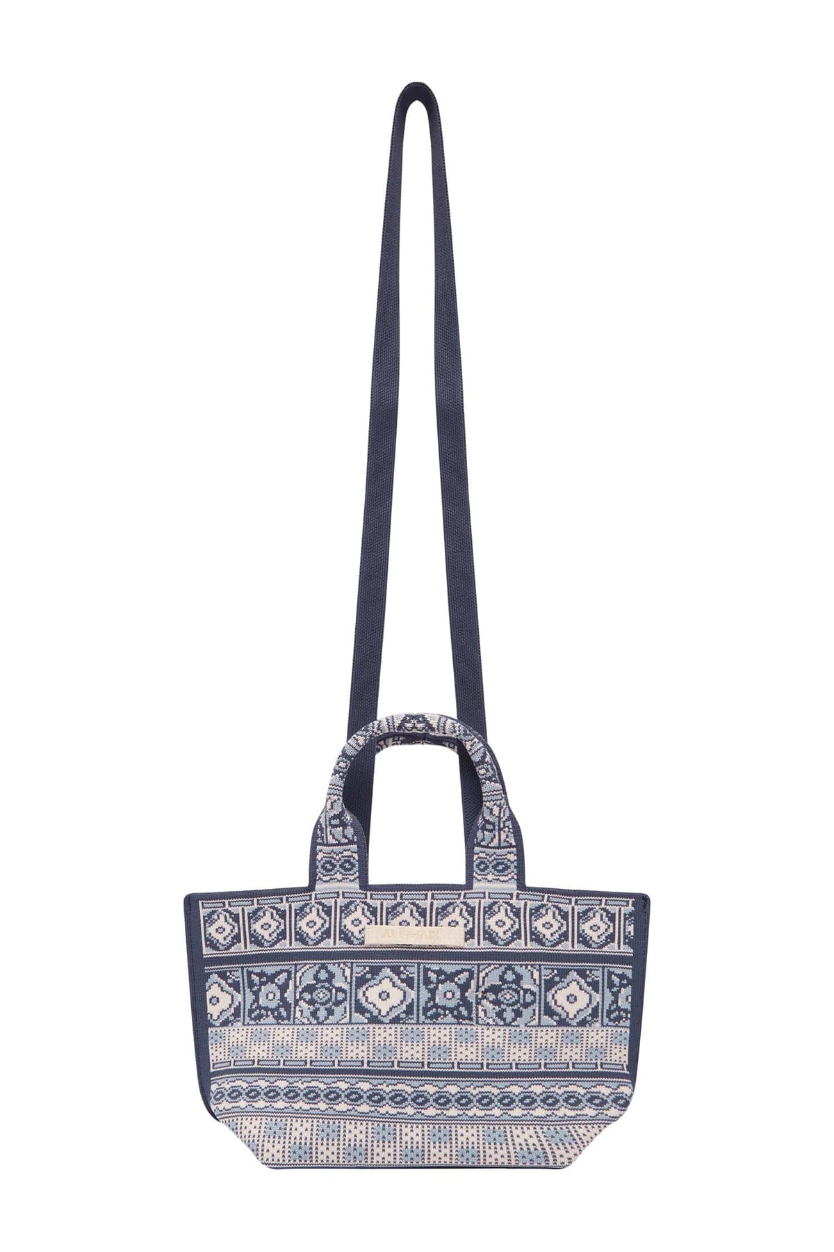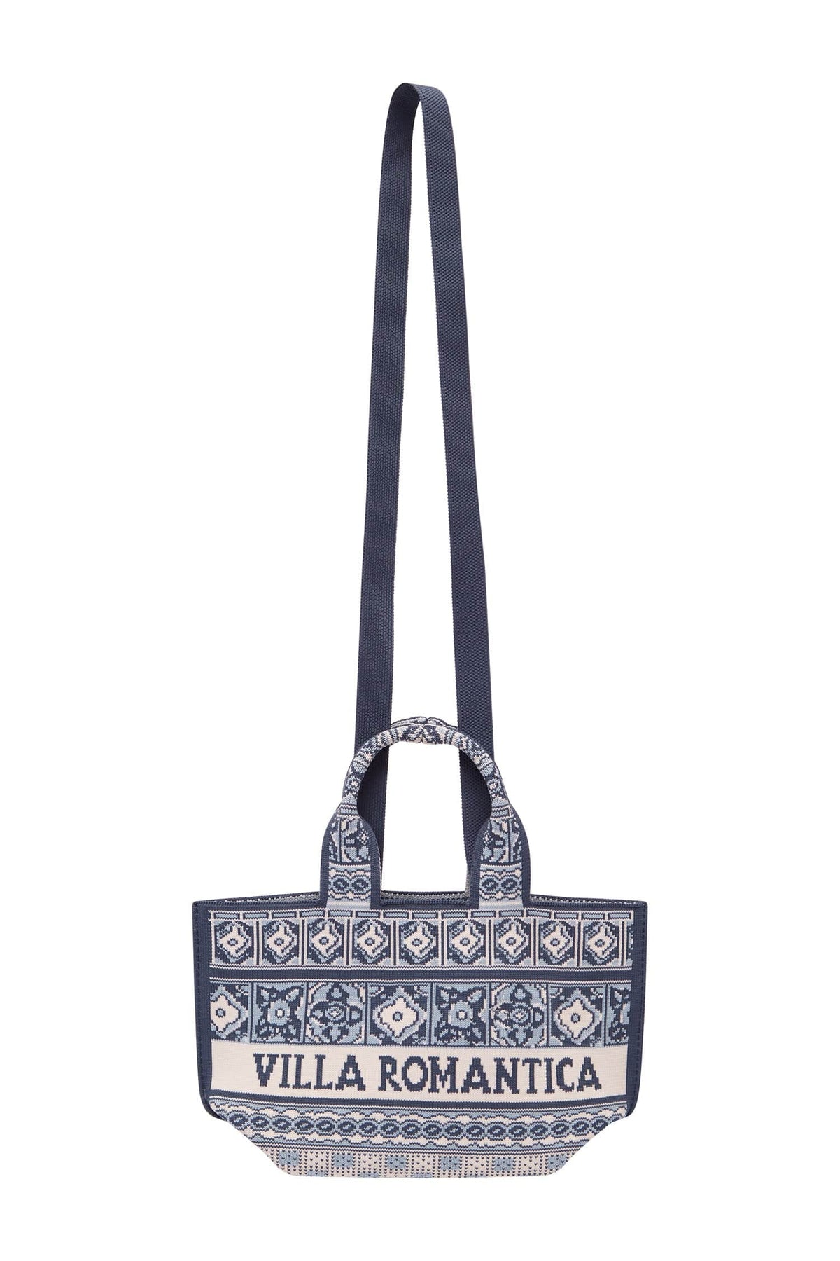 The ALEMAIS Villa Romantica Jacquard Micro Tote delivers bohemian luxury with intricate geometric patterning and compact functionality. Crafted from premium jacquard fabric in sophisticated navy and white, featuring traditional paisley motifs and architectural geometric designs. The structured mini tote silhouette with dual handles and adjustable crossbody strap offers versatile styling for contemporary wardrobes.