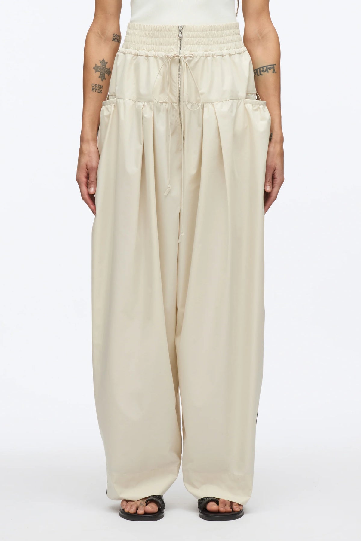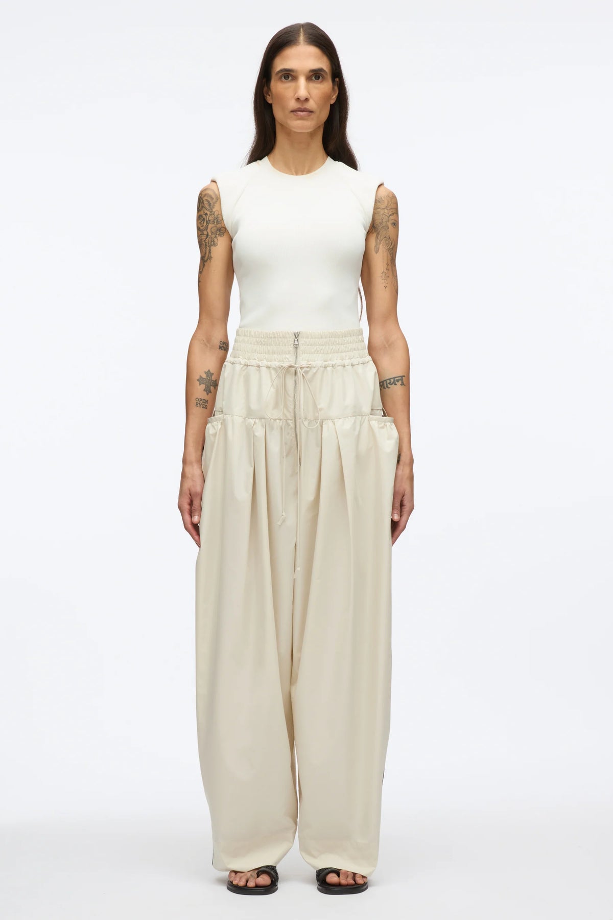 The 3.1 Phillip Lim Wide Leg Pant With Zipper delivers contemporary tailoring with a relaxed, modern silhouette. Crafted from lightweight cotton-blend fabric in soft cream, featuring an elasticated waistband for comfortable all-day wear. The wide-leg cut and functional zipper details create a sophisticated statement piece that bridges casual and elevated styling.