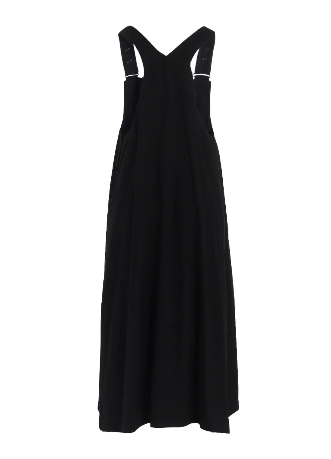 This is an overall-style dress featuring a chest single-pleat accent for an elegant feel. The high-back frame and non-slip shoulder straps are designed for comfort. Adjustable with buttoned straps, the dress fabric combines cotton firmness with rayon drapery, and has a unique texture with a crumpled surface.