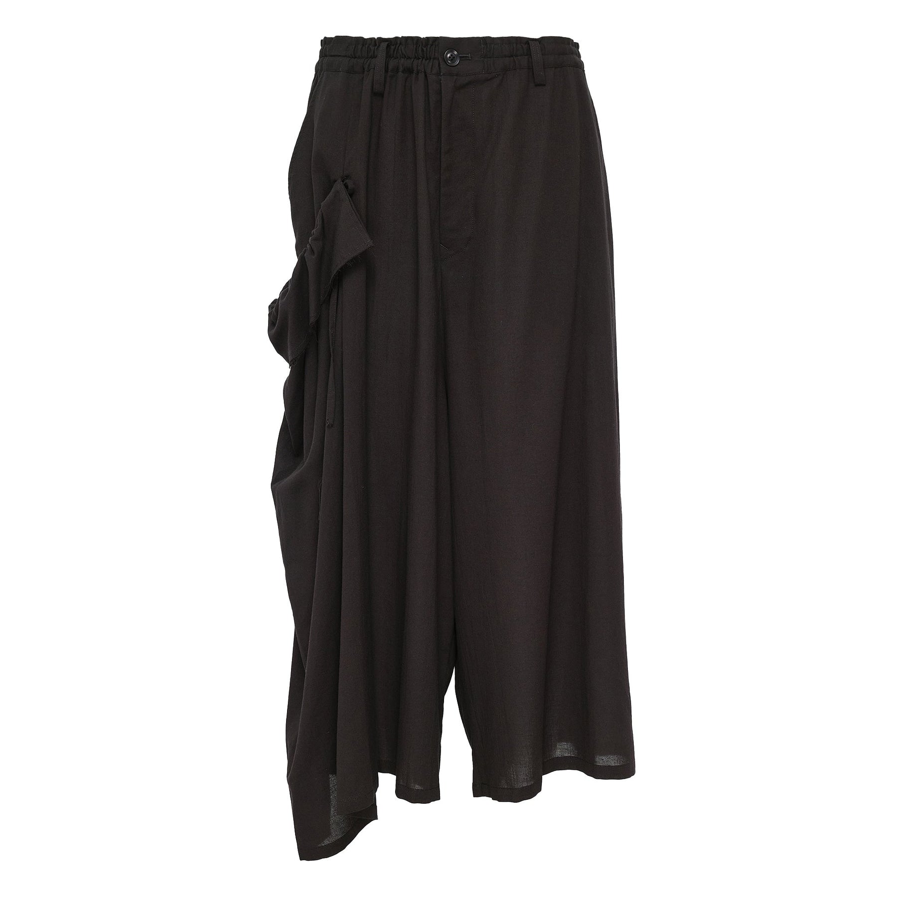 These draped pants are made of cotton Viyella fabric, known for its soft texture and puff feel. Featuring a flared silhouette and gathers, it's designed to not show body lines. The adjustable waist includes a drawstring for versatile fitting.